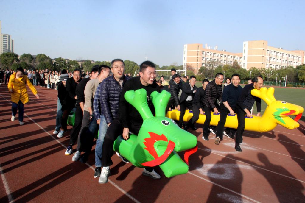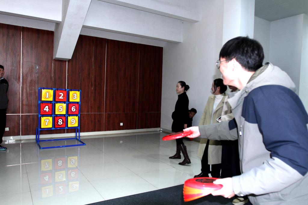 趣味运动会集竞技、娱乐、协作为一体,共设置了拔河和旱地龙舟两个团体项目和九宫格飞盘、趣味保龄球、定点投乒乓球等八个个人项目。
