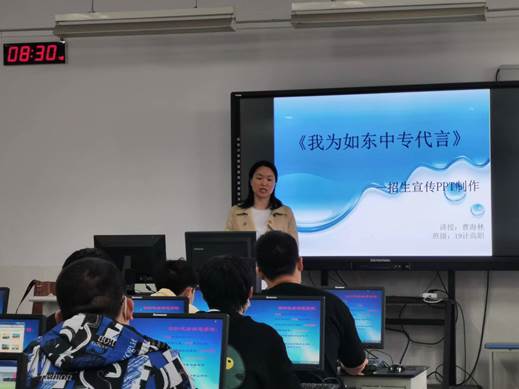 本次活动中,曹海林老师抓住身边学校的招生季创设情境,上了一堂名为《我为如东中专代言——招生宣传PPT制作》的计算机专业展示课,课上她让学生回顾自己的在学校求学经历,结合学校特点和相关新闻报道,从自己、从身边挖掘宣传素材,制作宣传PPT,即锻炼了学生的PPT制作能力,又更好的完成了教学目标。