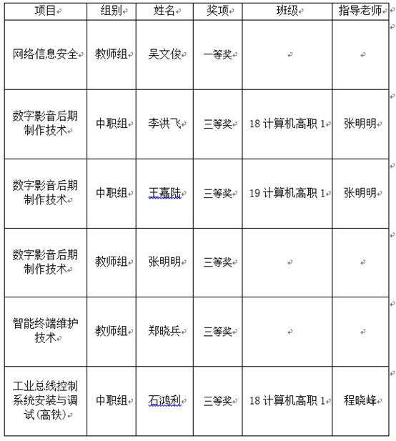 信息工程系师生于2020年10月26—28日参加了2020年南通市职业学校技能大赛信息技术类比赛,日前传来喜讯,我系师生获一个一等奖五个三等奖的好成绩,获奖情况如下表。